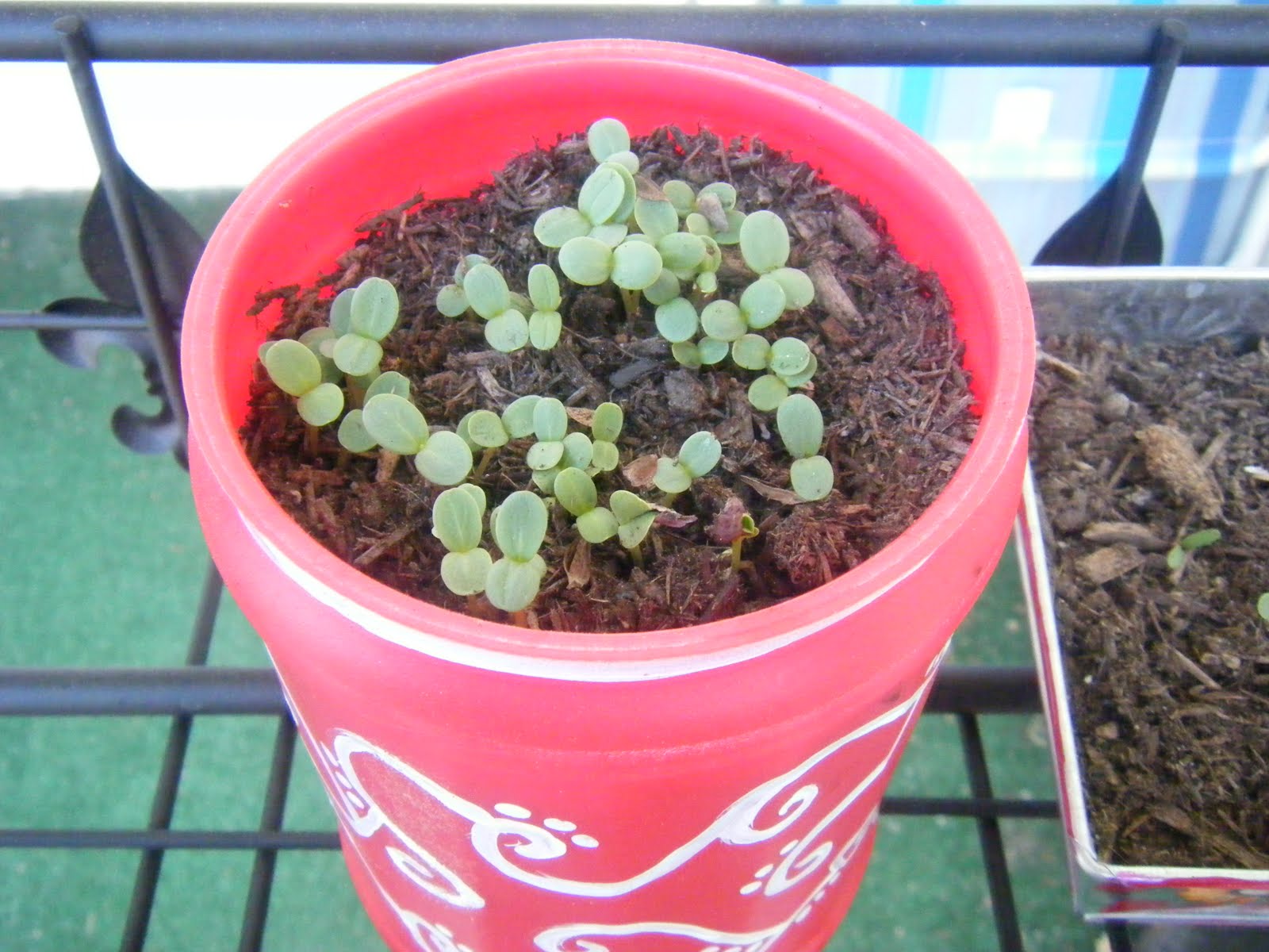last weekend i planted some little zinnia and marigold seedlings. i had cutie help me move the television out of the way of our "patio" so i can get started on my little garden. we moved figaro (my figgy tree) over and planted my little seedlings. here they are on day six. the red foldgers jar is sprouting up a storm and the tin pot seems to be taking its sweet little 'ol time... grRRRuff- but all good things come to those who wait i suppose.